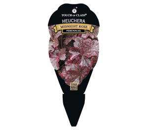 Heuchera Midnight Rose features dark mahogony foliage with pink polka dots. These dots grow as the leaf grows.
