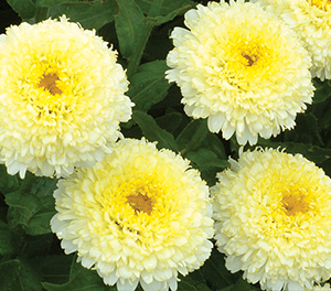 Leucanthemum Luna features showy pom-poms of double flowers atop a dense, upright, mound of foliage.